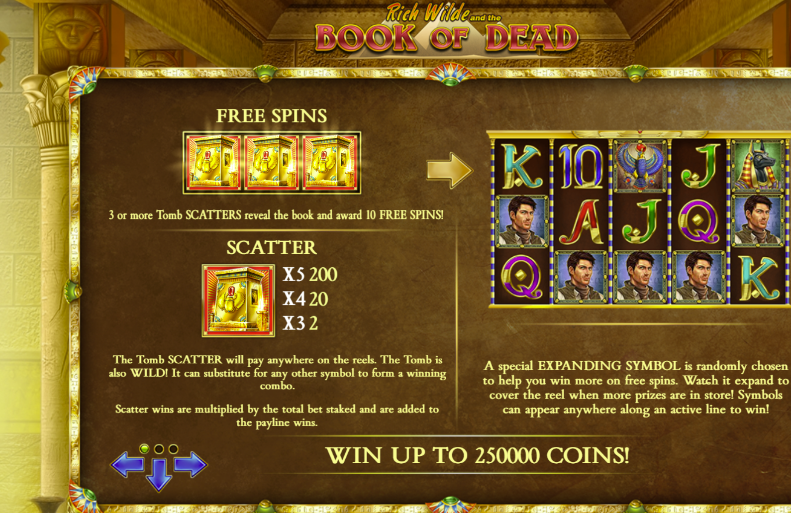 - Free Spins Bonus: Triggered by landing 3 or more Book of Dead scatter symbols. Awards 10 free spins with the expanding symbol feature active.
